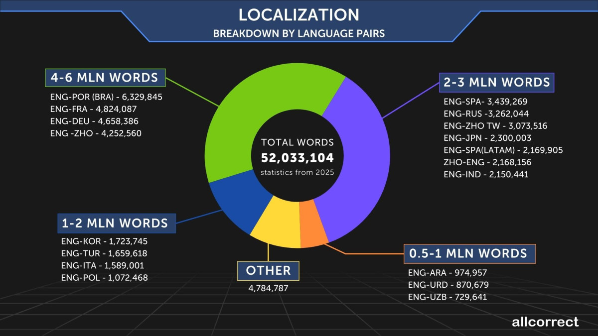 2025 for Allcorrect was marked by the launch of run.loc — an AI tool with 18 years of localization experience and 6 automatic checks that successfully localized 1 million words in a month across 4 languages. We attracted 77 new clients and gave 7 talks at 16 conferences with a revenue of 7.5 million dollars, although the outsourcing market is contracting under AI pressure and art is seeking its niche. Ahead we see a trend of clear separation between AI and manual work.